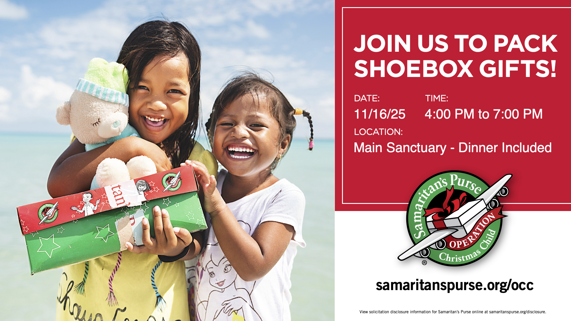 Join us at November 16th from 4:00pm to 7:00pm for the Operation Christmas Child Packing Party! Dinner will be served from 5:00pm to 6:30pm.