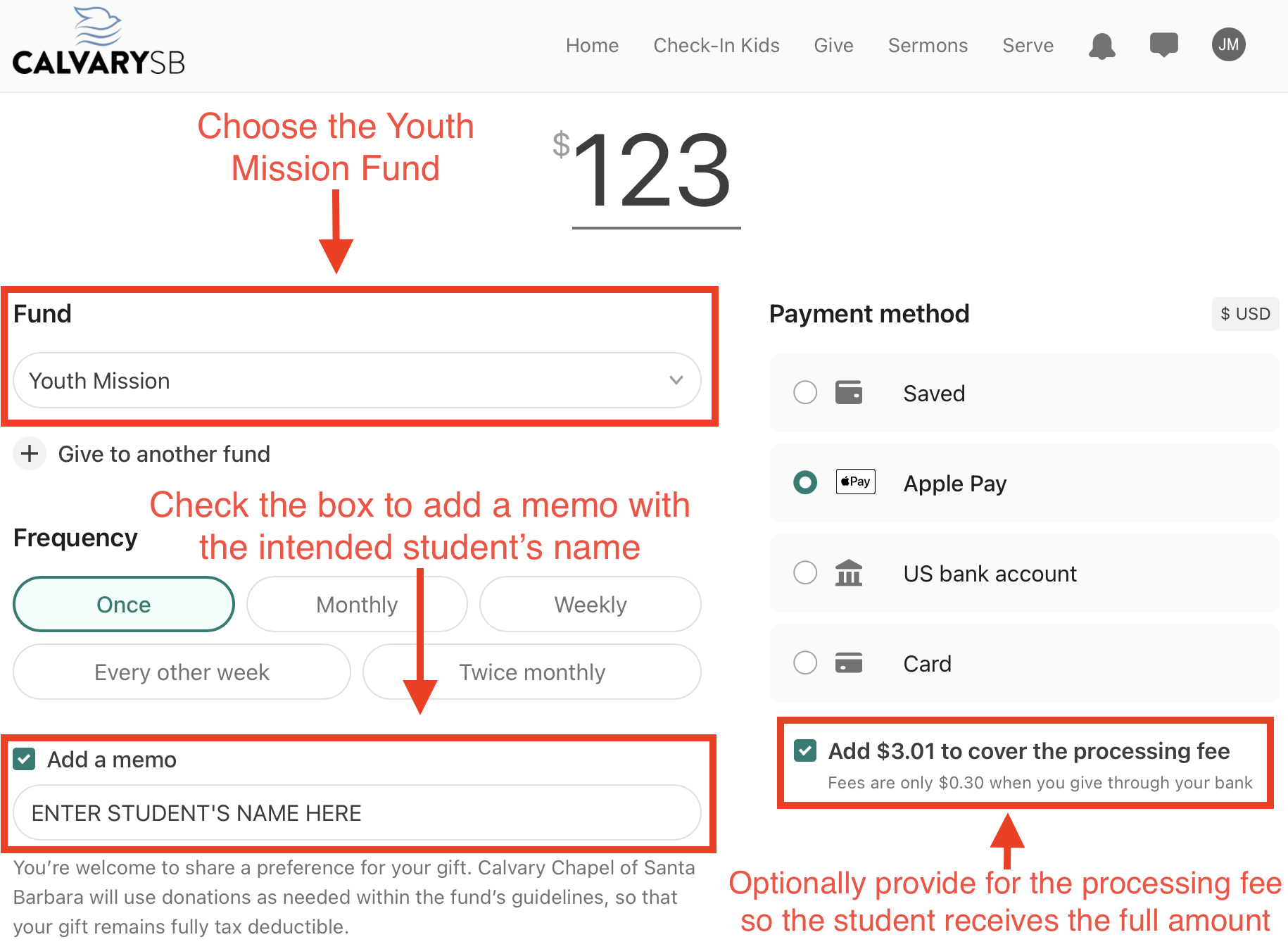 Check the box for “Add a memo” and enter the name of the student you would like your donation to support. If you would like to leave the designation of your gift up to the prayerful consideration of our team, then no memo is necessary.